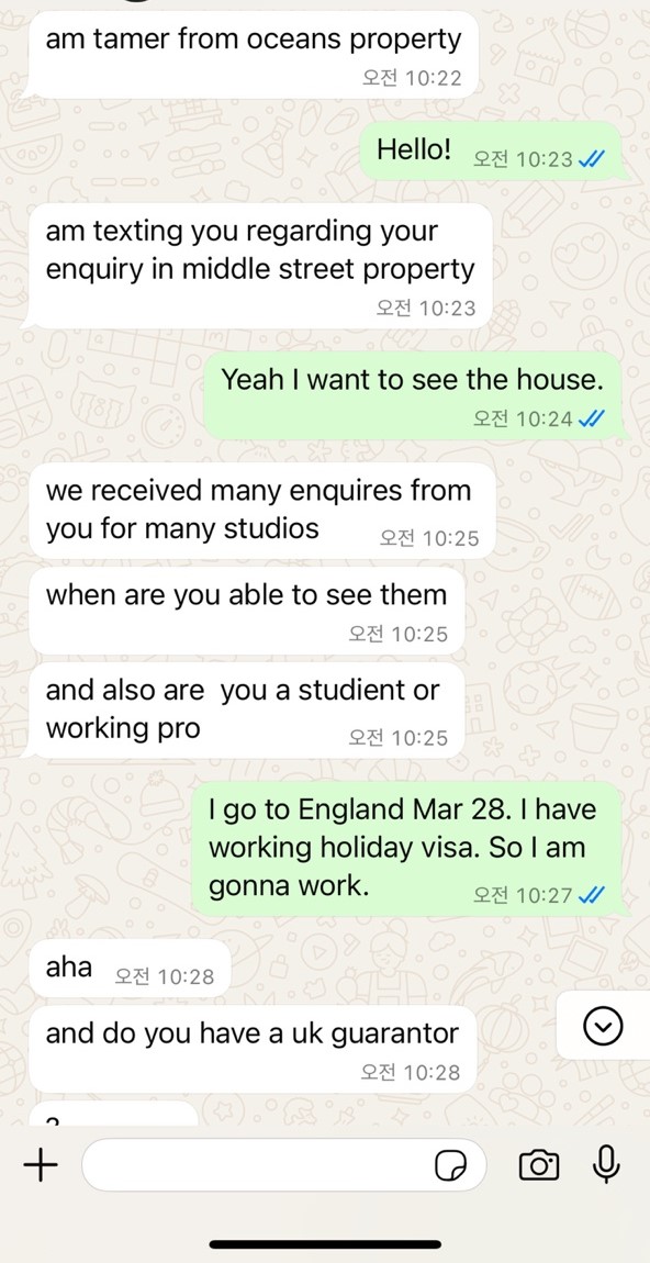 '저는 지금 한국에 있지만 3월 28일에 영국에 갑니다. 저는 아직 영국 번호가 없지만 와츠앱 번호라도 남기겠습니다. 뷰잉 약속을 잡고 싶습니다.'