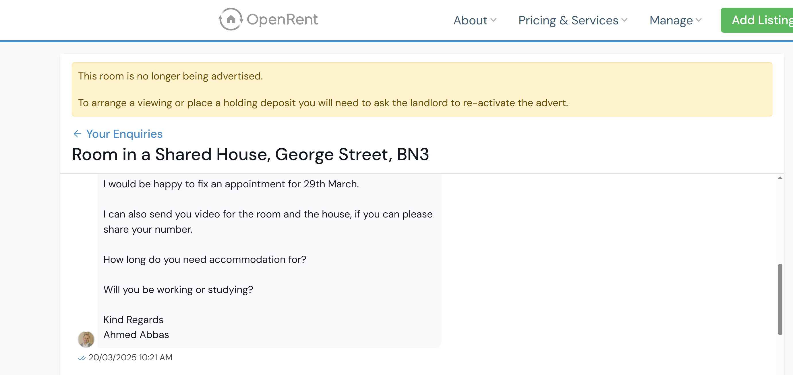 OpenRent는 중개 업체다. 근데 여기는 자기들 홈페이지 메시지를 통해서만 집주인과 얘기를 주고 받을 수 있다. 내가 직접 내 와츠앱 번호를 알려주려고 해도 그러지 않는 게 좋다며 자기들이 멋대로 내 번호를 지우고 집주인에게 전송한다. 게다가 시차 문제도 있지, 저 홈페이지 자체도 온전하지 않지, 그렇게 소통 오류가 있다가 매물이 사라졌더라...